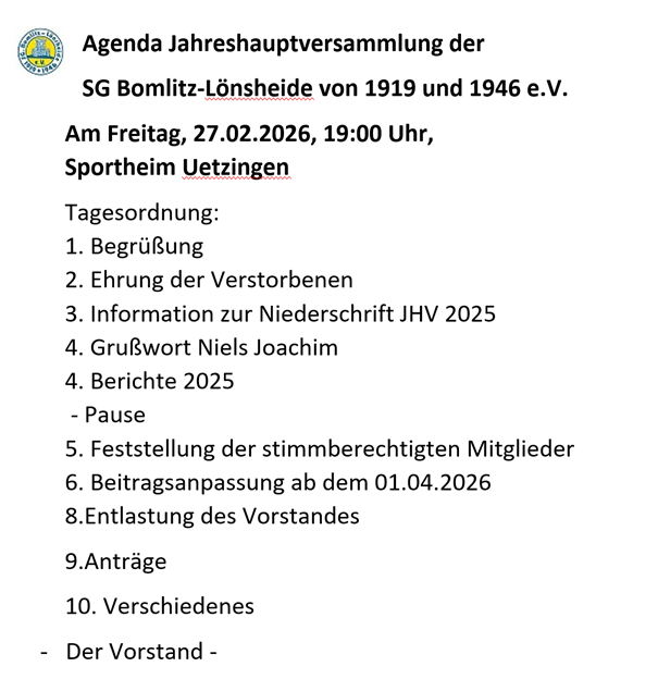 Jahreshauptversammlung Kommentar verfassen / Vorstand / Von Erhard Lühmann Sportheim „Wolfgang Bremer Sportanlage“ Uetzingen 27.02.2026 19:00 Uhr