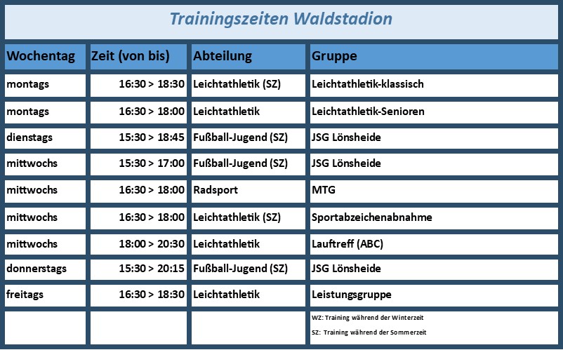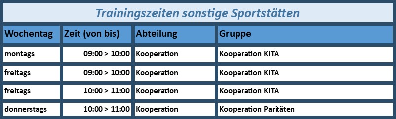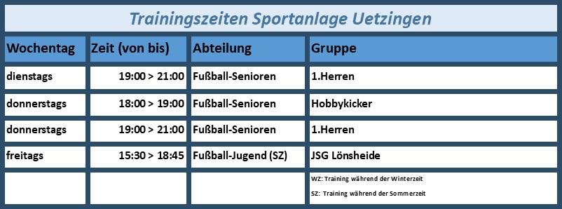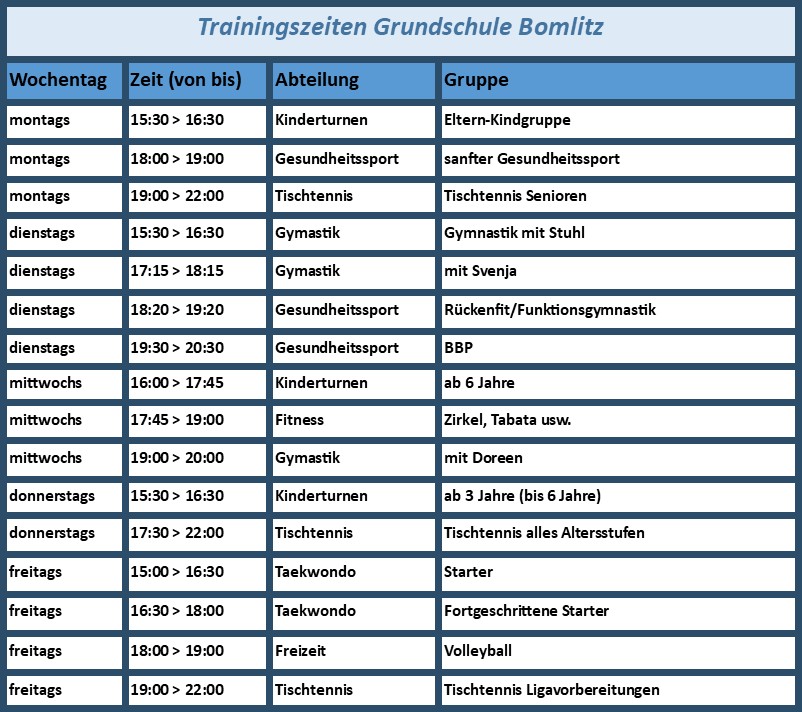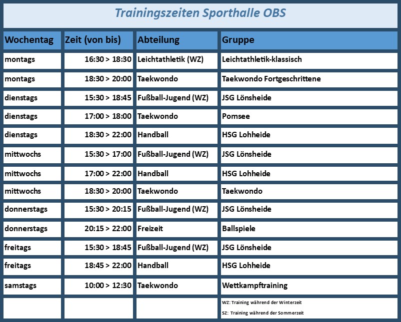 Trainingszeiten nach SportstättenTrainingszeitennach Sportstättennach Wochentagennach SportartenSportstättensonstige SportstättenDGHSporthalle OBSSportanlage UetzingenGrundschule BomlitzWaldstadionWaldstadion-Fitnessbereich Zurück